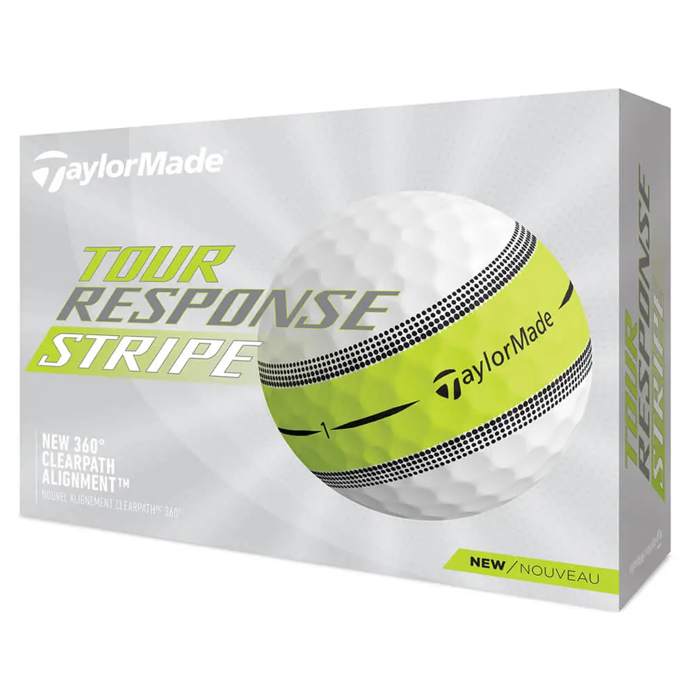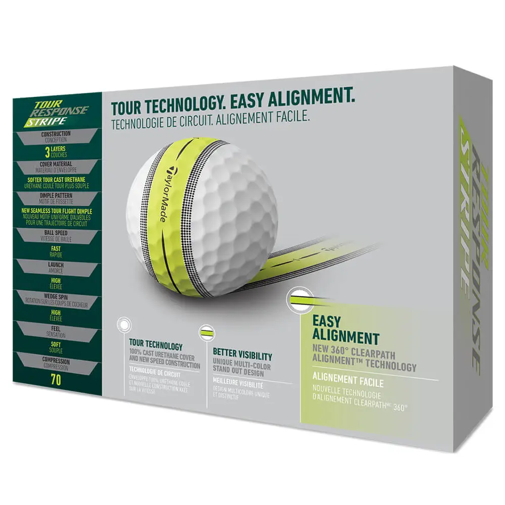 The Tour Response Stripe Golf Ball features 360° ClearPath Alignment™ technology which has been engineered with the golfer in mind. This next-gen visible technology of Tour Response Stripe™ wraps around the centre of the golf ball to help you aim putts better, faster and more consistently, all while providing immediate feedback on the quality of your roll. A lime yellow finish offers enhanced visibility.