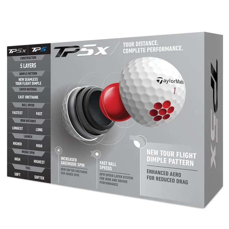 - The key to achieving enhanced speed without negatively affecting spin performance comes from TaylorMade’s proprietary 5-layer ball construction. Including a Tri-Fast Core that delivers maximum carry and low drag and a Dual-Spin Cover that features a soft, highly durable cast urethane cover, TP5x offers complete tee-to-green performance without sacrifice. The ultimate result is a ball that promotes a fast launch, maximum carry distances and a steep angle of descent for extra stopping power – especially on long irons.